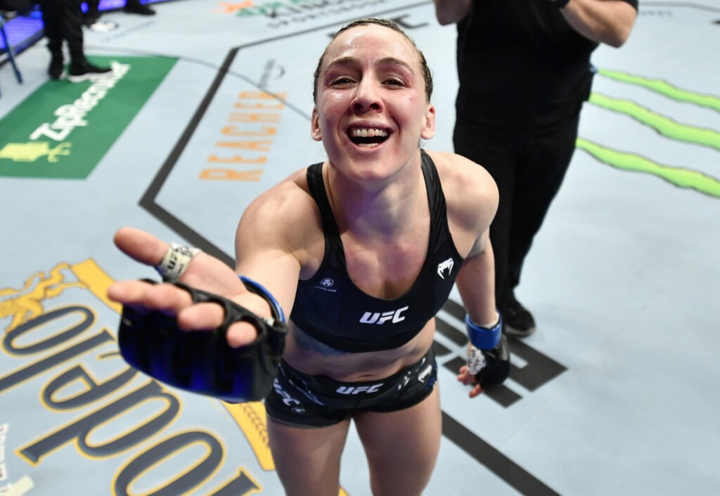 ANAHEIM, CALIFORNIA – JANUARY 22: Vanessa Demopoulos celebrates after her submission victory over Silvana Gomez Juarez of Argentina in their strawweight fight during the UFC 270 event at Honda Center on January 22, 2022 in Anaheim, California. (Photo by Chris Unger/Zuffa LLC)